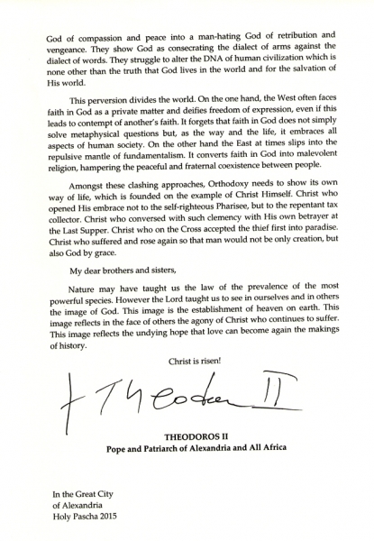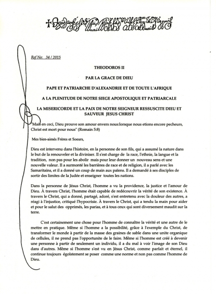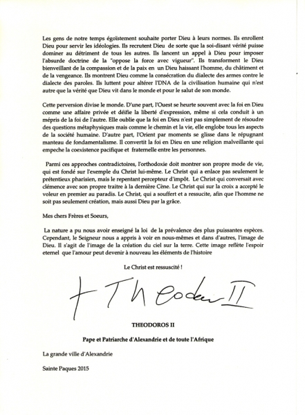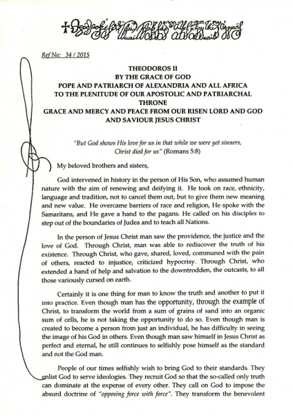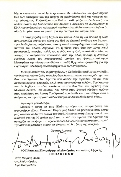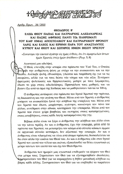 Η Πατριαρχική Εγκύκλιος του Σεπτου Προκαθημένου της Πρεσβυγενούς Εκκλησίας των Αλεξανδρέων, Μακαριωτάτου κ.κ.Θεοδώρου Β', για το Άγιον Πάσχα 2015.