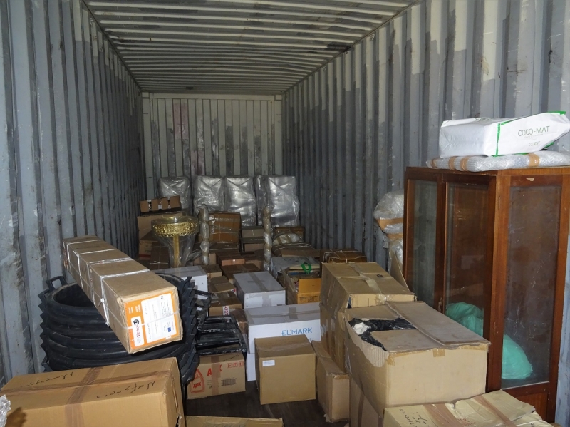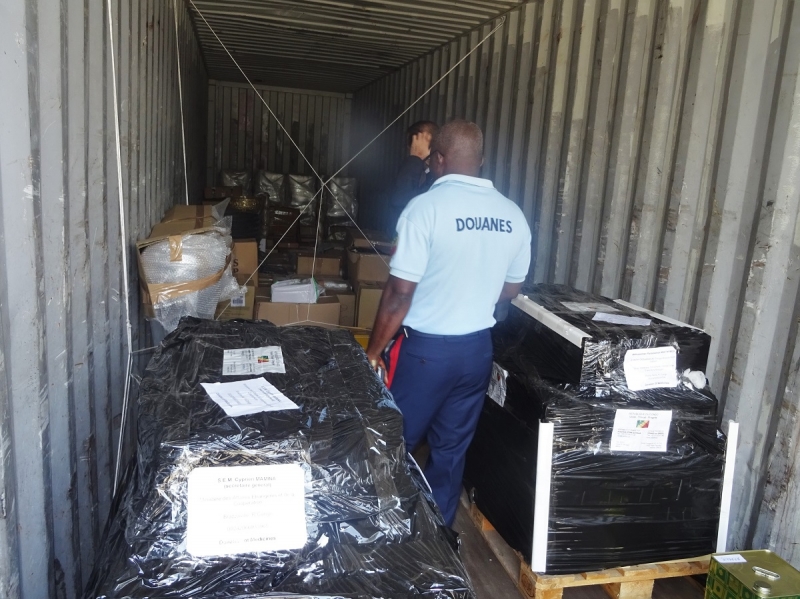 Το κοντέινερ, το οποίο αποστάλη με πρωτοβουλία της Ι.Μητροπόλεως διά της ευεργετικής προσφοράς της ΑΙΓΕΑΣ ΑΜΚΕ και του φιλογενούς διαχειριστού αυτής Εντιμ. κ.Αθανασίου Μαρτίνου, εμπεριέχει τα νέα ιερά σκεύη και απαραίτητα εκκλησιαστικά αντικείμενα για τον πλήρη εξοπλισμό του νέου Καθεδρικού Ναού Αγίου Δημητρίου Pointe-Noire, μεγάλου μεγέθους ιερές εικόνες για τον προς έτους εγκαινιασθέντα Ι.Ενοριακό Ναό Αγίας Φωτεινής Pointe-Noire και τον νέο Καθεδρικό Ναό, ιερά άμφια και ράσα για τους ιερείς, νέα γαλλόφωνα λειτουργικά βιβλία για τους Ναούς, είδη ρουχισμού, υπόδησης, κλινοσκεπάσματα και παιχνίδια για τα περιθαλπόμενα μικρά παιδιά στο ορθόδοξο Ορφανοτροφείο «Άγιος Ευστάθιος» και ικανή ποσότητα φαρμάκων για τους εμπεριστάτους Αφρικανούς συνανθρώπους μας, προσφορά του Εντιμ.κ.Χρήστου Κυλικά, Φαρμακοβιομηχάνου, ε.τ. Προξένου του Κονγκό-Μπραζαβίλ στην Ελλάδα.