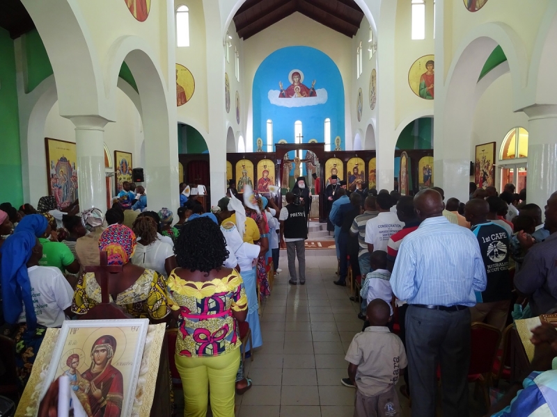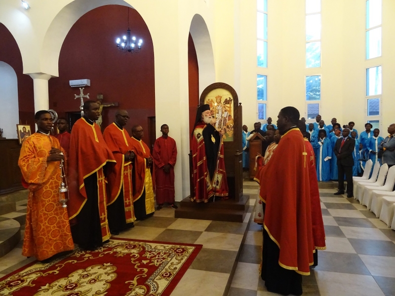 Το απόγευμα ο Μακαριώτατος χοροστάτησε κατά τον Μ.Εσπερινό των Eγκαινίων στον Ιερό Καθεδρικό Ναό Αγίου Δημητρίου Pointe-Noire, αφού προηγουμένως κατέθεσε τα ιερά λείψανα επί της προς εγκαινισμόν αγίας τραπέζης.