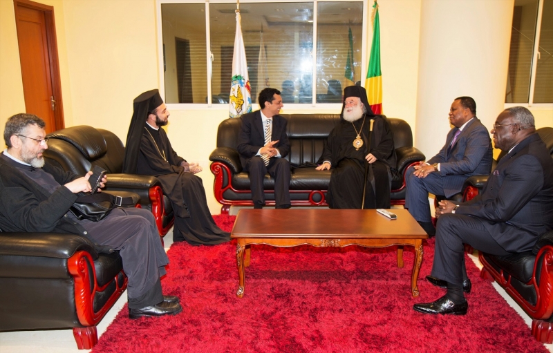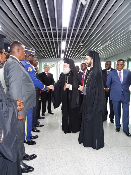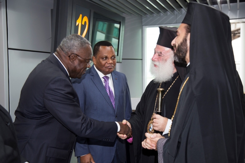 Στο διεθνή αερολιμένα Maya-Maya τον Μακαριώτατο υποδέχθησαν ο Σεβ.Μητροπολίτης Μπραζαβίλ και Γκαμπόν κ.Παντελεήμων, ο Εξοχ. Υπουργός Εξωτερικών κ.Jean Claude Gakosso, o Εξοχ. Υπουργός Πολιτισμού κ. Dieudonné Moyondo, ο Εξοχ. Κυβερνήτης Μπραζαβίλ, ο Εξοχ.Πρέσβυς της Αιγύπτου κ.Halem Hassan Kandit, o Εντιμ. Πρόξενος ε.τ. της Ελλάδος κ.Νικόλαος Περρής, ο κ.Δήμαρχος Μπραζαβίλ, κληρικοί, εκπρόσωποι των στρατιωτικών αρχών, των σωμάτων ασφαλείας και πλήθος πιστών. Το μεσημέρι ο Μακαριώτατος παρεκάθησε σε γεύμα, το οποίο παρέθεσε το Προξενείο της Ελλάδος.