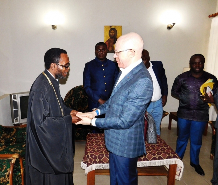 Τον κ.Υπουργό υπεδέχθη ο Γενικός Αρχιερατικός Επίτροπος της Ι.Επισκοπής, Αιδεσιμ. Πρωτοπρ.π.Μάξιμος Oumba, Διευθυντής του Ραδιοφωνικού Σταθμού, τον οποίο ενημέρωσε λεπτομερώς περί της συντελεσθείσης αναδιοργανώσεως αυτού. Ακόμη, μετέφερε τις ευγνώμονες ευχαριστίες του Θεοφιλ. Επισκόπου Μπραζαβίλ και Γκαμπόν κ.Παντελεήμονος για την επίσκεψη αυτή, η οποία περιποιεί τιμή για την Εκκλησία και αποτελεί αναγνώριση της κοπιώδους προσπάθειάς Της για την πνευματική προαγωγή της τοπικής κοινωνίας.
