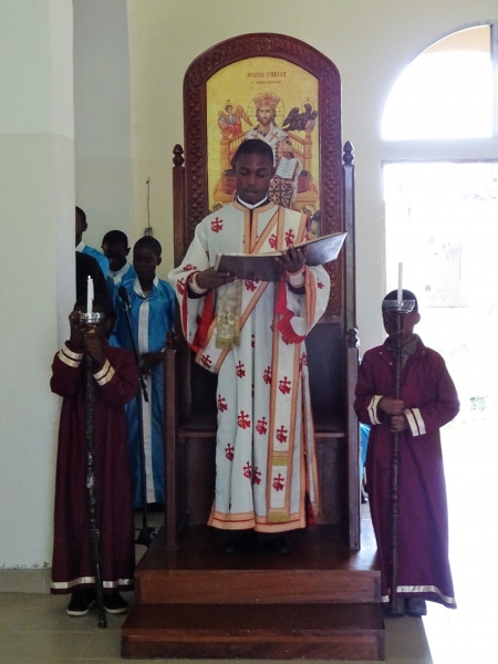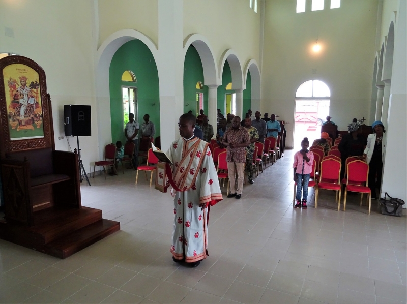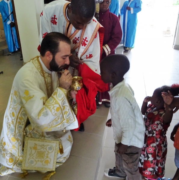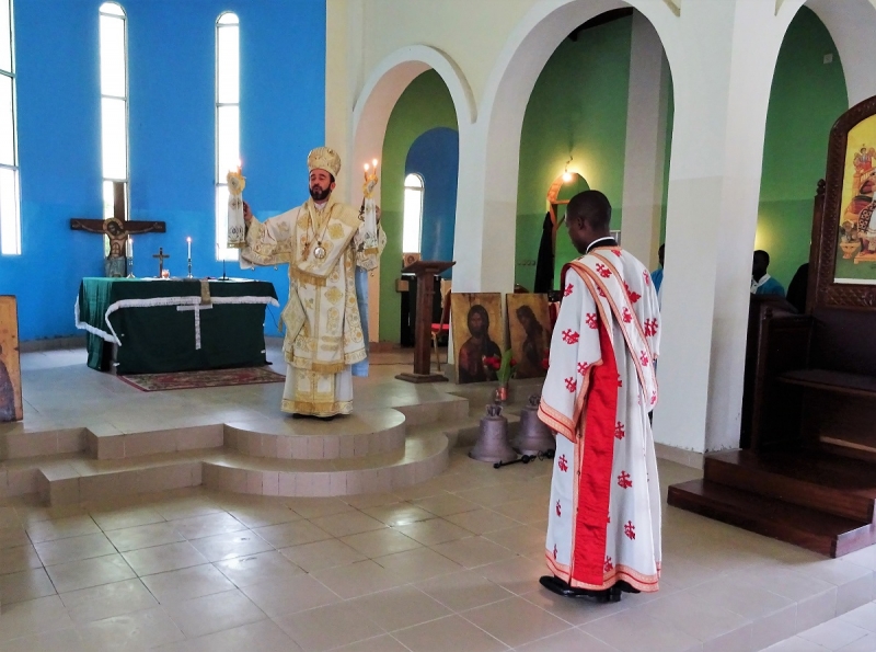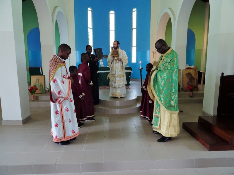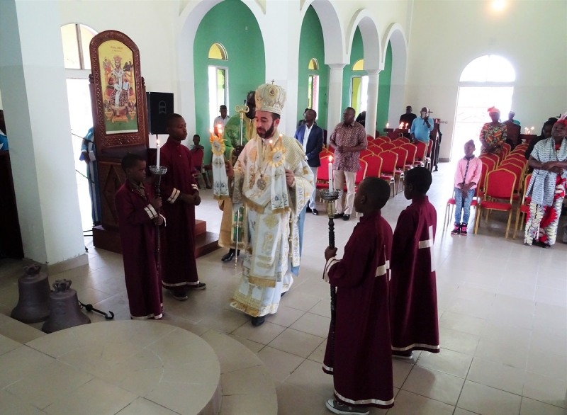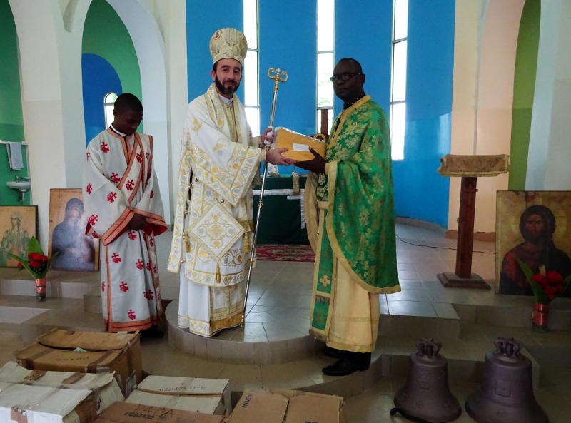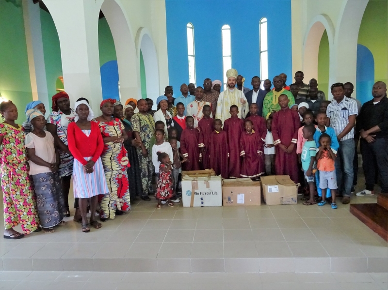 Τέλος, ο Μητροπολίτης προσέφερε μία ιερατική στολή στον Εφημέριο, Αιδεσιμ. π.Σιλουανό Nkounkou και ποσότητα ρούχων και παιχνιδιών στο εκκλησίασμα για την επερχομένη εορτή των Χριστουγέννων, το οποίο προσήλθε στην Θεία Λειτουργία παρά την ακατάπαυστη τροπική καταιγίδα.
