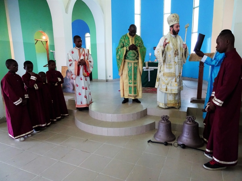 Επίσης, ευλόγησε τις δύο καμπάνες που για πρώτη φορά αποκτά ο ανεγειρόμενος Ναός, εκ των οποίων η μεγαλύτερη αποτελεί δωρεά της Αδελφότητος Ορθοδόξου Εξωτερικής Ιεραποστολής Θεσσαλονίκης και η μικρότερη της περιβλέπτου Ιεράς Μονής Σίμωνος Πέτρας Αγίου Όρους.