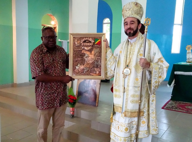 Μετά το πέρας της Ευχαριστιακής Συνάξεως ο μεγάλος ευεργέτης του Ναού και δραστήριος Πρόεδρος της Ενοριακής Επιτροπής κ.Michel Armand Massa, Μέλος του Μητροπολιτικού Συμβουλίου, προσέφερε στον Σεβασμιώτατο χαλκογραφία του Κονγκό-Μπραζαβίλ εκ μέρους των πιστών επί τη συμπληρώσει πενταετίας από την εις Επίσκοπον χειροτονία του (2 Δεκέμβριου 2012), ευχαριστώντας τον για τους μόχθους, την αγάπη, την υπομονή και την προσφορά του προς την Ορθόδοξη κοινότητα και τη χώρα, καθώς και επί τη ανυψώσει της τοπικής Εκκλησίας σε Ιερά Μητρόπολη.
