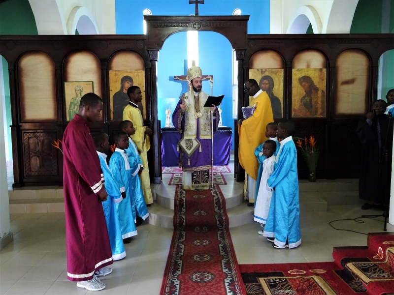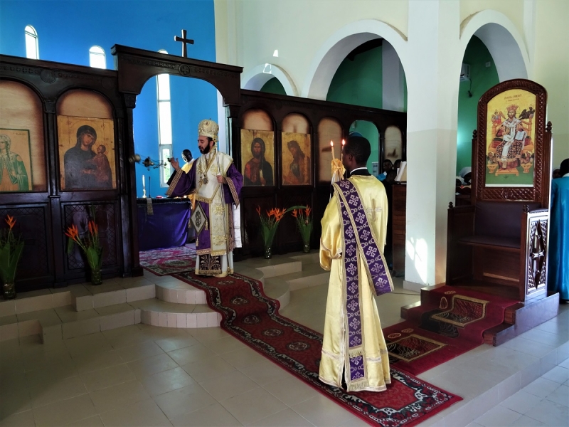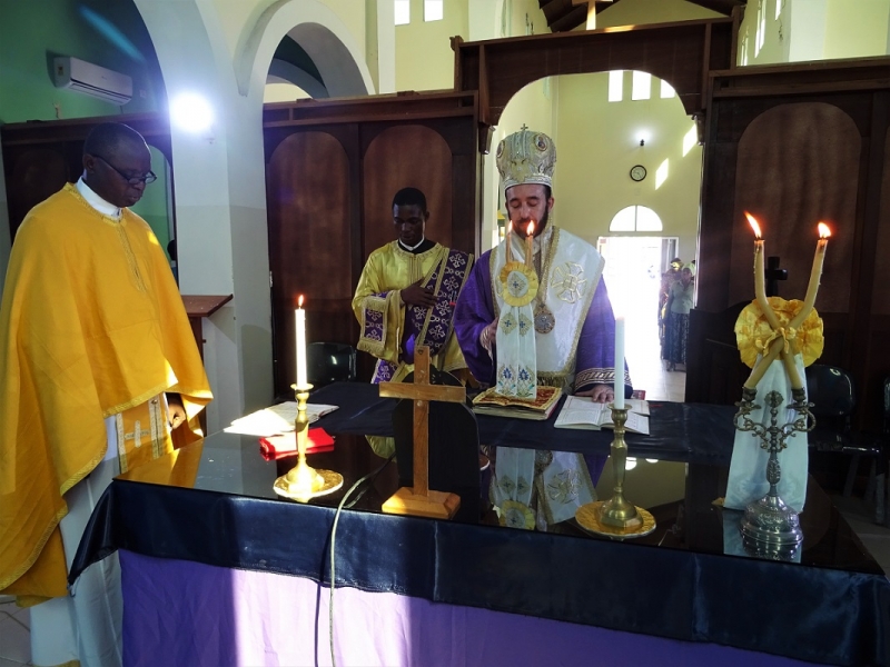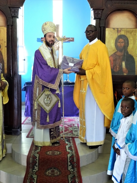 Τέλος, προσέφερε επαινετικώς καινούρια πένθιμη ιερατική στολή στον Εφημέριο, π. Σιλουανό Nkounkou, ο οποίος από του διορισμού του στην Ενορία το έτος 2014 ασκεί με αφοσίωση τα πνευματικά και λειτουργικά του καθηκόντα εντός του οικοδομουμένου Ναού.