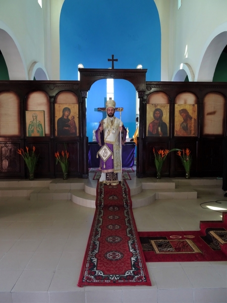 Προ του πέρατος της Ευχαριστιακής Συνάξεως, συνεχάρη εγκαρδίως την Εκκλησιαστική Επιτροπή για την ολοκλήρωση του κατασκευασθέντος από γηγενή ορθόδοξο ξυλογλύπτη εικονοστασίου, ως και για την τοποθέτηση του συστήματος κλιματισμού. Επίσης, συνεχάρη την πολυπληθή χορωδία του Ναού για την εντυπωσιακή εξέλιξή της κατά την διαρρεύσασα από της συγκροτήσεώς της διετία.