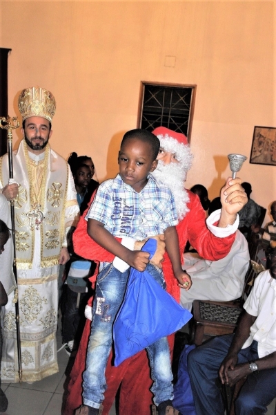 Τέλος, η επίσκεψη-έκπληξη του «Papa Noël» σκόρπισε χαρά στα μικρά παιδιά, αφού τους προσέφερε δώρα (καινούρια ρούχα και παιχνίδια) που ο Σεβασμιώτατος εξασφάλισε με την ευεργετική συναρωγή Ελλήνων αδελφών. Ακολούθησε εόρτια σύναξη των πιστών στον περίβολο του Ιερού Ναού υπό τους ήχους των παραδοσιακών μουσικών οργάνων. Την Θεία Λειτουργία και τις εόρτιες εκδηλώσεις εκάλυψε η κρατική τηλεόραση του Κονγκό-Μπραζαβίλ (Tele-Congo).