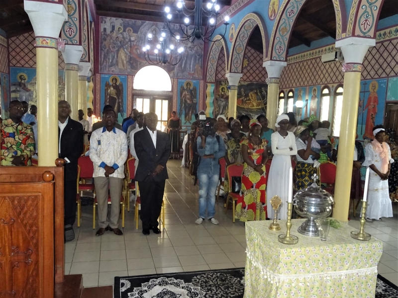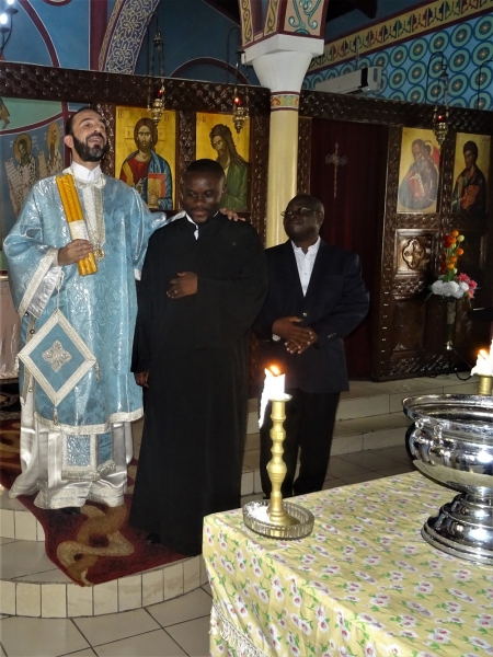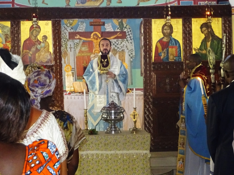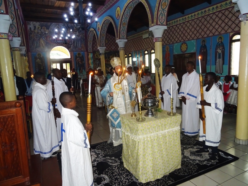 Κατά την επιστροφή στον Ι.Ναό προσέφερε επιγονάτιο στον Εφημέριο, Αιδεσιμ. Οικονόμο π.Σέργιο Mabelemo, παρουσίασε στο εκκλησίασμα τον υποψήφιο προς χειροτονία προσεχώς κ.Ιάκωβο Ntsoumou Miayokela και εδέχθη τις ευχαριστίες του Προέδρου της Ενοριακής Επιτροπής κ.Adrien Hossie για την επιδεικνυομένη πατρική μέριμνα και αγάπη.