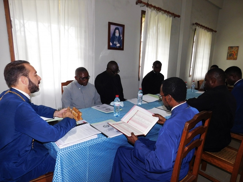 Οι ιερείς, Πρωτοπρ. Μάξιμος Oumba, Γενικός Αρχιερατικός Επίτροπος και Εφημέριος Ι.Καθεδρικού Ναού Αγίου Δημητρίου Pointe-Noire, Πρεσβύτερος Λαυρέντιος Mpinga, Εφημέριος Ι.Ναού Αναλήψεως Κυρίου Pointe-Noire, Πρεσβύτερος Δημήτριος Otomba, Εφημέριος Ι.Ναού Μεταμορφώσεως Κυρίου Nkayi, Πρεσβύτερος Σιλουανός Nkounkou, Εφημέριος Ι.Ναού Αγίας Φωτεινής Pointe-Noire, Πρεσβύτερος Παύλος Diafouka, Εφημέριος Ι.Ναού Αγίας Ειρήνης Dolisie, Πρεσβύτερος Τιμόθεος Ndzebe, Εφημέριος Ι.Ναού Τιμίου Προδρόμου-Αγ.Νικολάου Impfondo και ο διάκονος Στέφανος Anzdembe (ο Οικον. Σέργιος Mabelemo, Εφημέριος Ι.Ναού Αναστάσεως Κυρίου Brazzaville απουσίαζε για λόγους υγείας) μελέτησαν διεξοδικά, μαζί με τον Σεβ. Μητροπολίτη τους κ.Παντελεήμονα, το προσφάτως εγκριθέν από την ΑΘΜ νέο Καταστατικό της Ιεράς Μητροπόλεως Μπραζαβίλ -μετά την πρόσφατη εξ Επισκοπής ανύψωση Αυτής- και τον εμπλουτισμένο Κανονισμό Λειτουργίας των Ενοριών, προς εμπέδωση και λυσιτελέστερη συνεργασία επ’ωφελεία των πιστών. Επίσης, παρέδωσε τις νέες σφραγίδες των Ενοριών και των ευαγών ιδρυμάτων.