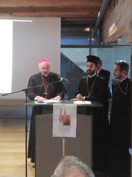 Στο συμπόσιο συμμετείχαν ο Σεβ. Επίσκοπος Ρέγκενσμπουργκ Dr. Rudolf Voderholzer, o Θεοφ. Επίσκοπος Λευκοπόλεως κ.Πολύκαρπος (Πατριαρχείο Βουλγαρίας), ο Παν. Αρχιμ. Πέτρος Κλιτς, εκπρόσωπος του Σεβ. Μητροπολίτου Γερμανίας, ο κ. Γεώργιος Βλαντής, Διευθυντής του Συμβουλίου Εκκλησιών της Βαυαρίας, κληρικοί, διακεκριμένοι πανεπιστημιακοί καθηγητές κ.α.