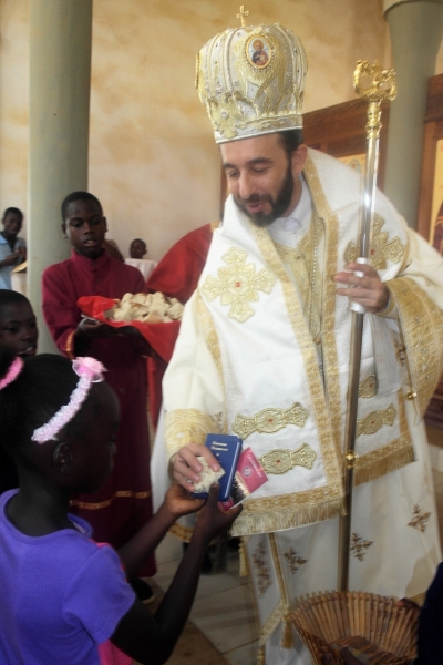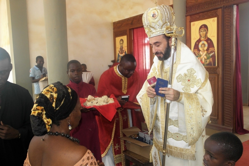 Την Κυριακή, 15η Ιανουαρίου, ο Θεοφιλέστατος ετέλεσε Αρχιερατική Θεία Λειτουργία και κήρυξε τον θείο λόγο, συλλειτουργούντων των π.Δημητρίου Otomba και π.Παύλου Diafouka, Εφημερίων των πόλεων Nkayi και Dolisie αντιστοίχως. Ακόμη, προσέφερε ρούχα και ιερά εικονίδια στα μικρά παιδιά, ενώ διένειμε αντίτυπα της Καινής Διαθήκης και το εγκόλπιο Ημερολόγιο 2017 της τοπικής Ορθοδόξου Εκκλησίας σε όλο το εκκλησίασμα, με το οποίο είχε τη χαρά της εκτενούς επικοινωνίας μετά το πέρας της Ευχαριστιακής Σύναξης.