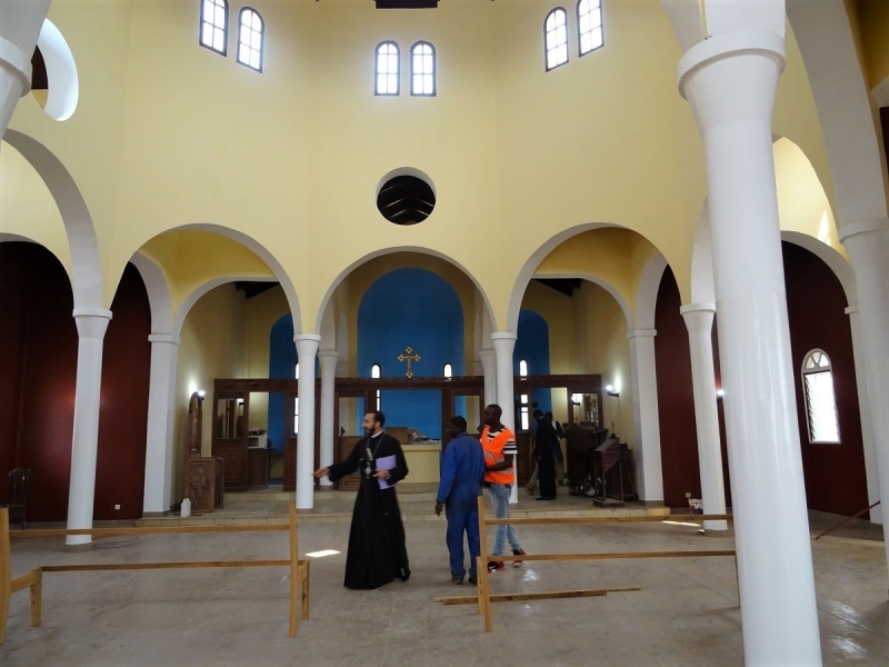 Κατά την πολύωρη παραμονή του στον Ναό ο Σεβασμιώτατος είχε εκτενή συνεργασία με τον επιβλέποντα μηχανικό κ.Christian Kibongué. Μαζί επιθεώρησαν λεπτομερώς κάθε σημείο του οικοδομήματος εσωτερικώς και εξωτερικώς, επί του οποίου οι κατασκευαστικές εργασίες αποπερατώνονται σύντομα.