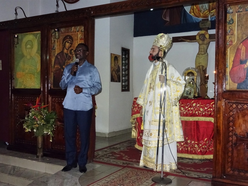 Ακολούθησαν αντιφωνήσεις των κ.Seraphin Bhalat, Γενικού Διευθυντού του Αυτονόμου Λιμένος Pointe-Noire, Μέλους του Μητροπολιτικού Συμβουλίου και του Αναγνώστου κ.Makaya, Προέδρου της Ενοριακής Επιτροπής του Καθεδρικού Ναού, οι οποίοι εξέφρασαν την ευγνωμοσύνη των πιστών για την πατρική αγάπη και την ανύστακτη ποιμαντική μέριμνα του πρώτου ορθοδόξου Ποιμενάρχου του Κονγκό-Μπραζαβίλ, Σεβ. κ. Παντελεήμονος, για την εν γένει δυναμική πορεία της τοπικής Ορθοδόξου Εκκλησίας που συμπληρώνει κατά το παρόν έτος 35 χρόνια ζωής στο Κονγκό (1984-2019), ως και για την μετά από 19 έτη ολοκλήρωση της κατασκευής του περίβλεπτου Καθεδρικού Ναού (2000-2019), ο οποίος θα εγκαινιασθεί προσεχώς από την ΑΘΜ τον Πάπα και Πατριάρχη Αλεξανδρείας.