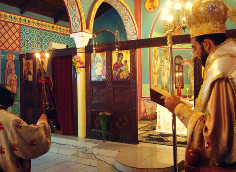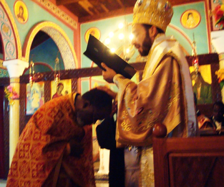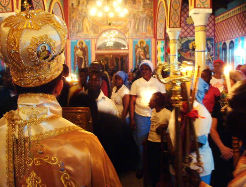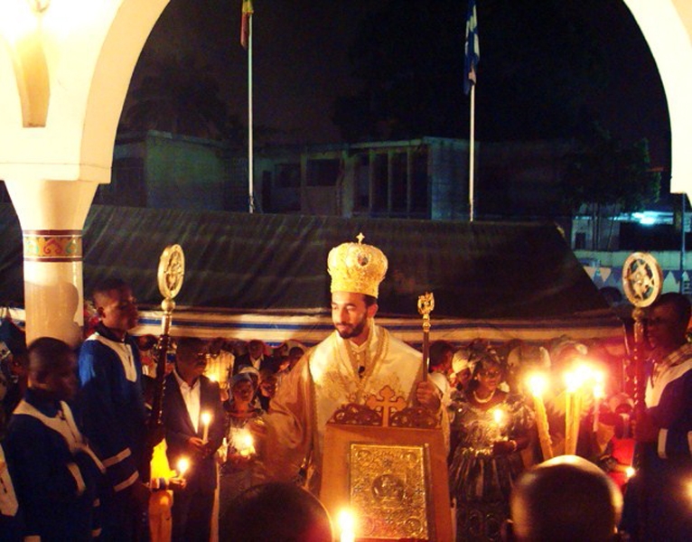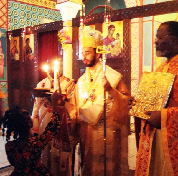 Κατόπιν έλαβε χώρα η τέλεση της Ακολουθίας της Αναστάσεως και της Θείας Λειτουργίας, κατά την οποία ο Θεοφιλέστατος, κατόπιν ευλογίας της ΑΘΜ του Πάπα και Πατριάρχου Αλεξανδρείας και πάσης Αφρικής κ.κ.Θεοδώρου Β’, απένειμε το οφφίκιο του Πρωτοπρεσβυτέρου στον Αιδεσιμ.π.Bernard Diafouka, Εφημέριο του Ναού επί εικοσαετία.