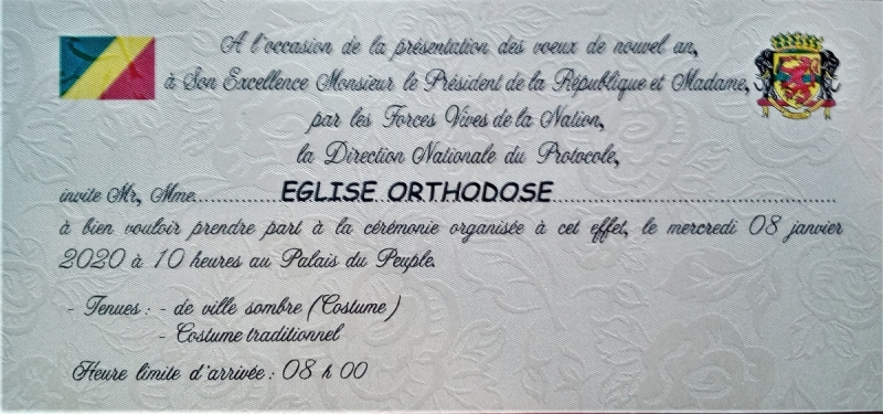 Την Τετάρτη, 8η Ιανουαρίου 2020, ο Σεβ. Μητροπολίτης Μπραζαβίλ και Γκαμπόν κ. Παντελεήμων μετέβη αεροπορικώς στην πρωτεύουσα Μπραζαβίλ του Κονγκό, προκειμένου να συμμετάσχη, κατόπιν προσκλήσεως της Προεδρίας της Δημοκρατίας του Κονγκό-Μπραζαβίλ, στην τελετή υποβολής εορτίων ευχών στον Εξοχ.Πρόεδρο της Δημοκρατίας κ. Denis Sassou N’guesso και την Ερίτ. Σύζυγό του Κα. Antoinette Sassou N’guesso.